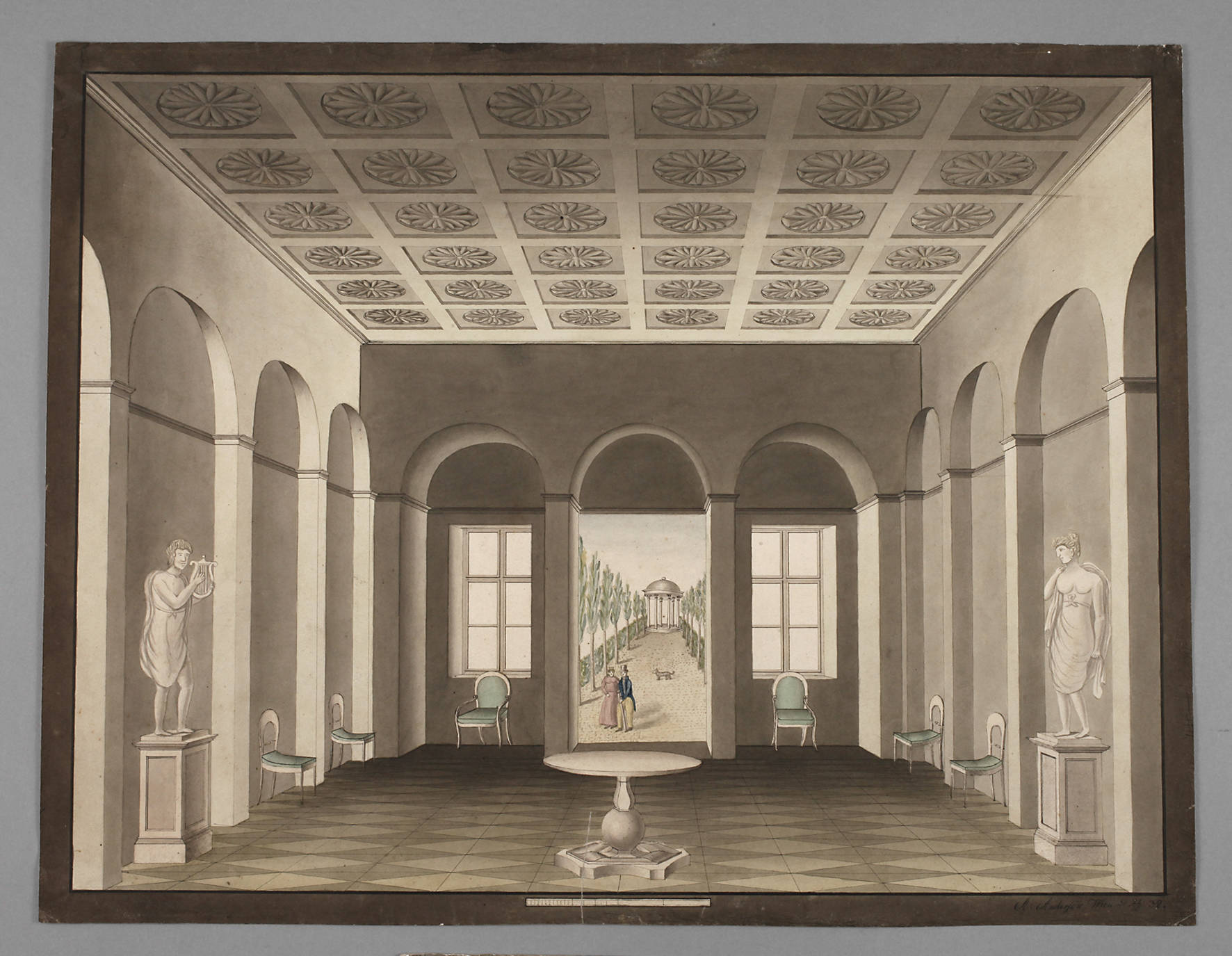 Blick in einen klassizistischen Raum, mit Statuen in den Wandnischen, die geöffnete Tür gibt den Blick auf eine Baumallee mit Tempel frei, aquarellierte Tuschezeichnung auf Bütten, rechts unten signiert, bezeichnet und datiert „A. Andersen Wien 22.10.(18)32“, hinterlegter Einriss, leichte Erhaltungsmängel, ungerahmt, Blattmaß ca. 40,5 x 52,5 cm.