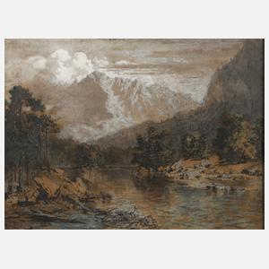 Blick vom steinigen Flusslauf, über Bäume am Ufer, zur imposanten Hochgebirgskulisse am Horizont, hierzu bemerkt Wikipedia: ”Er entnahm seine Motive vorzugsweise den deutschen und österreichischen Alpen, wobei er den Schwerpunkt auf Großartigkeit des Charakters legte.”, gekonnt studienhaft-flott erfasste Landschaftszeichnung, Mischtechnik (Tuschezeichnung sparsam aquarelliert), um 1830, links unten ligiert signiert ”HHeinlein”, Erhaltungsmängel, hinter Glas gerahmt (defekt), Falzmaße ca. 52 x 68 cm. Künstlerinfo: eigentlich Heinrich Carl Heinlein, dt. Landschaftsmaler und Zeichner (1803 Weilburg bis 1885 München), Gymnasium in Mannheim, zum Kaufmann bestimmt, schließlich der Familientradition folgend, Ausbildung zum Bauconducteur bei Bauinspector Dyberhoff und Weiterbildung bei seinem Oheim Karl Christian Riedel in Bayreuth, studierte ab 1822 Architektur bei Friedrich Gärtner an der Akademie München, parallel Ausbildung zum Landschaftsmaler, Studienabbruch wegen studentischen Duellierens, 1825 Studienreise nach der Schweiz, Tirol, Oberitalien und Wien, 1826 in Mannheim und Studien im Schwarzwald, ab 1830 in München tätig, ab 1945 Ehrenmitglied der Münchner Akademie, Quelle: Thieme-Becker, Allgemeine Deutsche Biographie, Matrikel der Münchner Akademie, Boetticher, Nagler und Wikipedia.