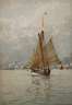 Segelschiff auf stiller See, unter effektvoll bewölktem Himmel, mit spitzem Pinsel stimmungsvoll erfasste Marinemalerei in fein abgestimmter Farbigkeit, Aquarell, links unten signiert und datiert ”E. de Martino (18)83”, geringe Altersspuren, freigestellt hinter Glas gerahmt, Blattmaß ca. 17 x 12 cm. Künstlerinfo: auch Edoardo Federico oder Edward di Martino, italienischer Marinemaler (1838 Meta bei Neapel bis 1912 London), Schüler der Kunstschule Neapel, zunächst 1849–55 Marinemaler im italienischen Unabhängigkeitskrieg, anschließend in Montevideo tätig, ab 1868 in Rio de Janeiro ansässig und Studienaufenthalt in Porto Alegre, schuf als Hofmaler des Kaisers Don Pedro von Brasilien 1868–69 Schlachtenbilder aus dem Krieg mit Paraguay, beschickte 1870 die Kunstausstellung der Akademie Rio de Janeiro und wurde 1871 zum korrespondierenden Mitglied der Kaiserlichen Akademie der bildenden Künste Rio de Janeiro ernannt, ab 1875 in London und zeitweise in Cowes auf der Isle of Wight ansässig, 1892 Ernennung zum Ritter (Chevalier) des Ordens der Krone von Italien, ab 1895 ”Marine Painter in Ordinary to her Majesty Queen Victoria”, ab 1902 Commander des Royal Victorian Order, vertreten in der Sammlung des britischen Königshauses, Quelle: Thieme-Becker, Visitenkarte des Künstlers und Internet.