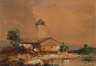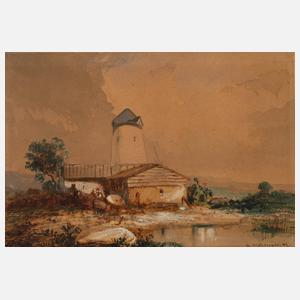 verlassene Windmühle am Ufer eines Weihers, Aquarell und Deckweiß auf leichtem Karton, unten rechts signiert und datiert „A. Mödinger (19)49“, gebräunt, rückseitig Reste früherer Montierung, ungerahmt, Blattmaß ca. 13,6 x 19,6 cm. Künstlerinfo: dt. Landschafts-, Genre- und Vedutenmaler (erwähnt 1848–58), beschickte die Berliner Akademieausstellungen, tätig in Potsdam, später in Berlin, Quelle: Internet.