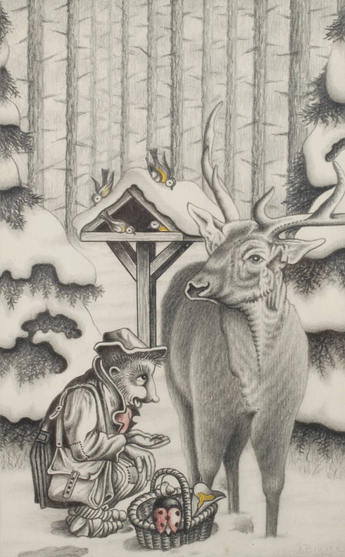 drollige Szene im tief verschneiten Winterwald, Igel füttert Hirsch, Marienkäfer und Meisen am Futterhaus, Mischtechnik (Blei- und Buntstift), rechts unten signiert und datiert ”K. Braune (19)78”, hinter Glas gerahmt, Falzmaße ca. 29,5 x 21 cm. Künstlerinfo: dt. Zeichner (1901 bis 1987), tätig in Weißenfels.
