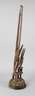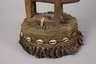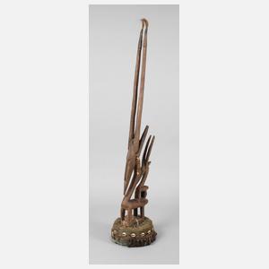 Mali, 20. Jh., der Volksgruppe der Bambara zugeordnet, Holz fein beschnitzt, in Form einer weiblichen Pferdeantilope, auf dem Rücken eine kleine Antilope tragend, dies ist das Stammestier der Bambara, der Aufsatz wird im Tji-Wara Ritus verwendet, das ist der fünfte der sechs Initiationsriten der Bambara, der sich der Verbindung zum Kosmos annimmt und die Beziehung zum Ackerbau herstellt, das Unterteil besteht aus grobem Gewebe und geflochtenen Pflanzenfasern, umlaufend mit Kaurischnecken verziert, meisterhafte Arbeit, H ca. 100 cm.