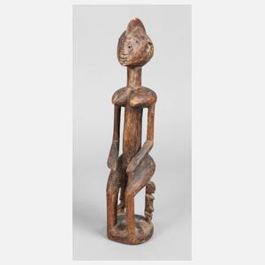 Burkina Faso, der Volksgruppe der Mosi zugeschrieben, braunes, leicht krustiertes Tropenholz, fast stilisierte Darstellung einer sitzenden Frau, H 40 cm.