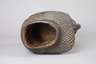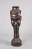 Ebenholz geschnitzt, Darstellung des Kopfs einer Afrikanerin, mit Kaurischnecken als Augen, Haare und Basis mit Kerbschnitt verziert, der lange Hals mit Reifenzier, rückseitig mit großem Griff, oben ausgehöhlt, wohl als Trinkgefäß gedacht, neuwertig, H 45 cm.