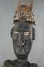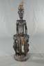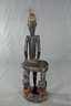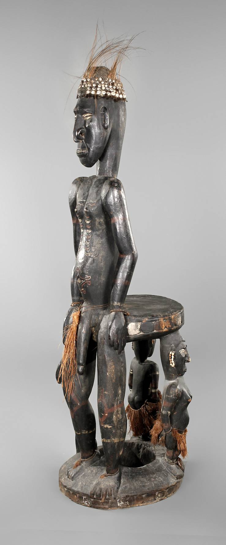 Angola, 20. Jh., den Chokwe oder den Luwa zuzuordnen, helles Tropenholz, aus einem Stück gefertigt und schwarz eingefärbt, mit vollplastischer Darstellung einer sitzenden männlichen Figur, welche die Lehne und zwei Standbeine bildet, diese reich farbig tatauiert, mit Kaurischnecken als Augen und Verzierung der Kopfbedeckung, kantige Nase, dominanter Penis, Zierbänder um Hand- und Fußgelenke, Sitzplatte und Standring reliefiert verziert, zwei weibliche Darstellungen mit Baströcken und noch teilweise vorhandenem Ohrgehänge dienen als weitere Standbeine, diese ebenfalls mit Kaurischnecken als Augen, Farbfassung partiell stark verblichen, H ges. 149 cm, Sitzhöhe 65 cm.