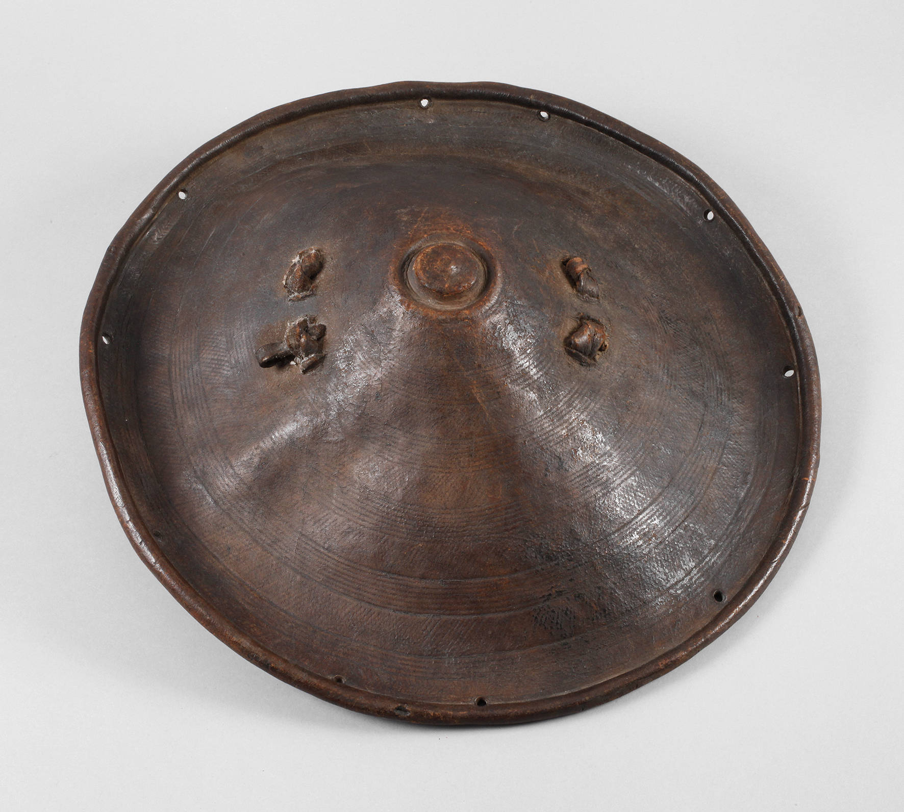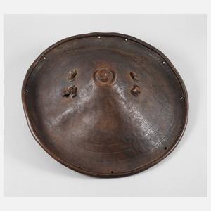 wohl Sudan, 2. Hälfte 19. Jh., stark gewölbtes Schild aus Hartleder, verziert mit geprägtem Muster, Rand verstärkt, lederummantelter, kräftiger Griff, sehr gute Erhaltung, D 52 cm.