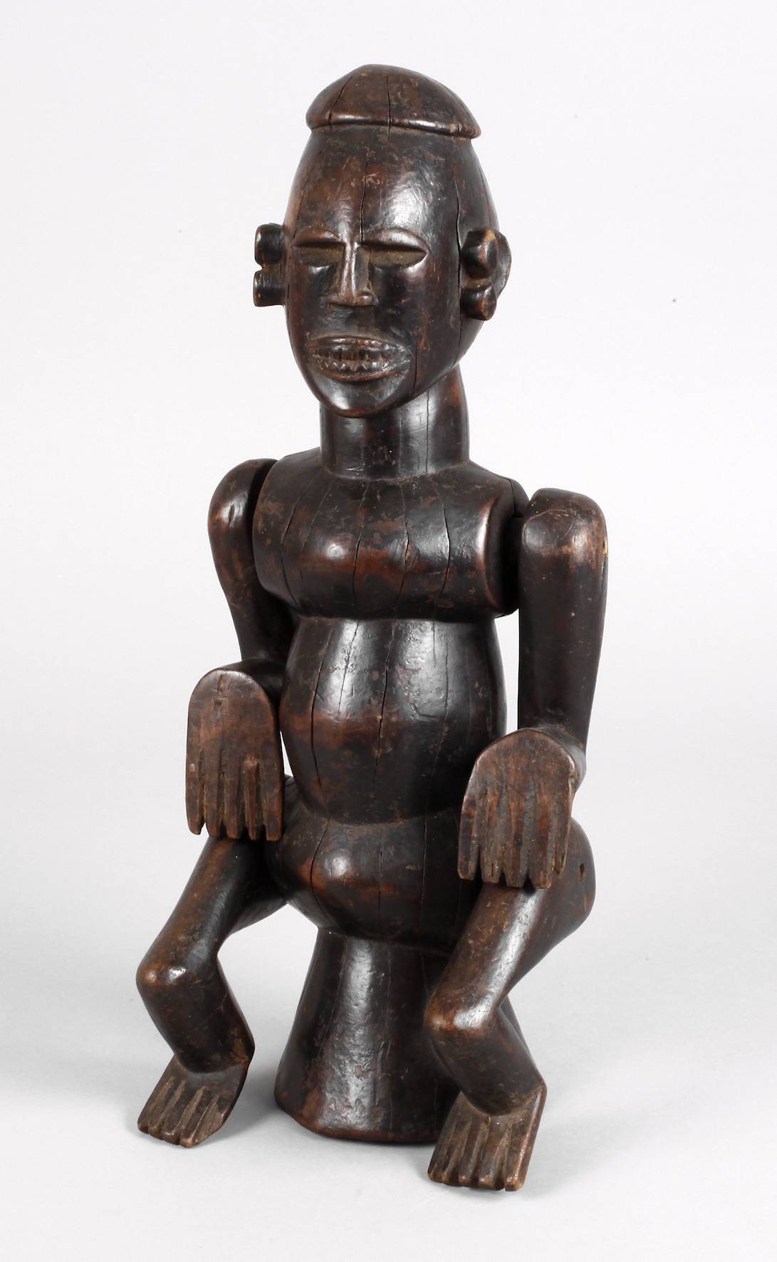 Westafrika, 20. Jh., den Ibibio aus dem Nigergebiet zugeschrieben, hartes, schwarz eingefärbtes Tropenholz fein beschnitzt, vollplastische Darstellung eines sitzenden Mannes mit beweglichen Gliedmaßen und Kappe auf dem Kopf, H 42 cm.