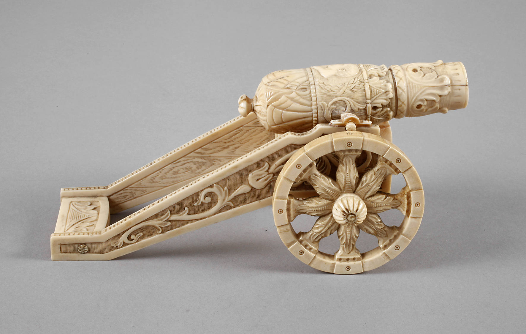 19. Jh., Elfenbein aufwendig mehrteilig geschnitzt, montiert, und reich ornamental reliefiert, Lafette mit zwei beweglichen Speichenrädern, ebenfalls beweglich gelagertes, konisches Rohr mit im Hochrelief gearbeiteten Portraitmedaillon Napoleons sowie historisierendem Zierrat, Altersspuren, sonst gute Erhaltung, L ca. 18 cm. BITTE BEACHTEN: VERSAND ERFOLGT NUR INNERHALB DER EU – SHIPPING TO THE 28 EU MEMBER COUNTRIES ONLY