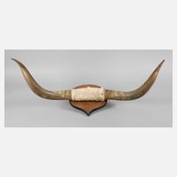 Gehörn eines afrikanischen Watussirindes, auf Eichenholzplatte montiert, mittig mit Fell bezogen, L ca. 120 cm.