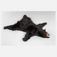 präpariertes, naturgetreu gestaltetes Bärenfell, mit eingesetzten Glasaugen und aufgerissenem Maul, dieses mit Hartplastik verstärkt, Krallen vorhanden, auf grobem Leinen aufgezogen, Maße ca. 150 x 140 cm.