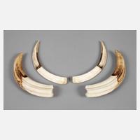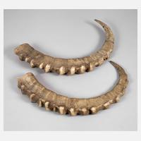 Alter unbestimmt, wohl Hörner des Alpensteinbocks, braun, teilweise mit verheilten Ausbrüchen von Jahresknoten, L je ca. 90 cm.