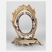 2. Hälfte 19. Jh., runder, drehbar gelagerter Spiegelrahmen, Holz geschnitzt, besetzt mit vier Hirschhornrosen, davon zwei geschnitzt, Rahmen aus Damhirschschaufeln, Aufhängung provisorisch durch zwei Schrauben repariert, zwei Keilerzähne bestoßen, H 60 cm.