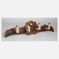 um 1910, Eiche massiv, beschnitzt und bräunlich gebeizt, mit Eichenlaub verziertes Brett mit vier Haken aus präparierten Vorderläufen von Rehböcken, L 83 cm.