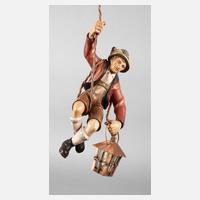 20. Jh., Holz geschnitzt und farbig gefasst, rückseitig mit originalem Klebeetikett ”Nebelhorn Holzschnitzerei Alois Ohmayer, Bildhauer, Oberstdorf Allgäu”, vollplastische Darstellung eines jungen Burschen in Tracht, in seiner Hand eine kleine Laterne aus Kupferblech haltend, diese einflammig elektrifiziert, H 30 cm.