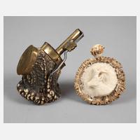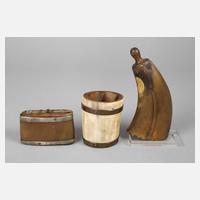 18./19. Jh., Horn geschnitzt, Messingmontierungen, Becher, Schnupftabakdose und Pulverflasche, Altersspuren, partielle Substanzverluste, L max. 17,5 cm.
