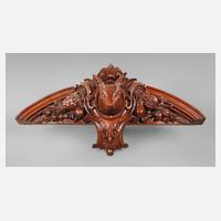 deutsch, um 1870, aus massivem Nussbaum geschnitzt, mit plastischem Rehkopf verziert, Gehörn fehlt, H 55 x B 106 x T 34 cm.