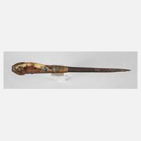undatiert, hölzerner Messergriff, wohl in Form eines Affen, vermutlich Pavian, der sich um einen Stamm klammert, einfache Eisenklinge mit Figurenpunze, sichtbare Alters- und Gebrauchsspuren, L ca. 17 cm.