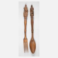 wohl Brienz, 19. Jh., ungemarkt, Löffel und Gabel mit figürlich gearbeiteten Griffstücken in Form vollplastischer Jäger, kleinere Fehlstellen, einer alt geklebt, L je ca. 30 cm.