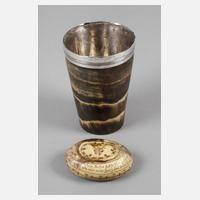 19. Jh., flache Tabatiere mit graviertem Landschaftsmotiv, Floraldekor und Umschrift, dazu Becher mit Montierung aus Silberblech und eingesetztem Boden, Altersspuren, H Becher 12 cm, L Tabatiere 7,5 cm.