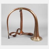 Anfang 19. Jh., aus der königlich-hannoverschen Jagd, Schloss Marienburg, Messing-Inventarnummer bezeichnet ”1173”, u-förmiger Korpus mit Neusilbermontierungen, gedrechseltes Mundstück aus Horn, originales Ledergehänge, partiell alt repariert, Länge ca. 57 cm. Provenienz: Works of Art from the Royal House of Hanover, Schloss Marienburg, Sotheby's, Oktober 2005, Los 846 (Teil).