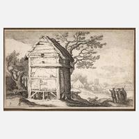 am Dorfrand stehende, teils von Bäumen umwucherte Windmühle, mit drei vorbeiziehenden Männern, Radierung auf schwachen Bütten mit Wasserzeichen, vgl. Hollstein 332, um 1600, in der Platte ligiertes Monogramm „AB“ und Nummer 9, umlaufender, min. 8 mm breiter Papierrand, minimale Erhaltungsmängel, am Rand geschlossener Einriss, unter Passepartout, Darstellungsmaß ca. 9,2 x 15,1 cm, Blattmaß ca. 11,3 x 17,2 cm. Künstlerinfo: niederländischer Maler und Grafiker (1564 Gornichem bis 1651 Utrecht), lernte in Utrecht und Paris, ab 1597 in Amsterdam ansässig, ab 1611 in Utrecht tätig, Quelle: Thieme-Becker und Wikipedia.