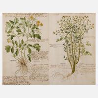 zwei Seiten aus dem 1543 erstmals in Basel erschienenen Kräuterbuch ”New Kreuterbuch, in welchem nit allein die gantz histori, ... des meysten theyls der Kreuter so in Teutschen und andern Landen wachsen, ... beschriben, sonder auch aller derselben wurtzel, stengel, ... abgebildet und contrafayt ist ...” von Leonhart von Fuchs, dabei das mit ”CCCL. [350]” nummerierte Blatt ”Weinraut [Weinraute]” und das mit ”CCCCXCVI. [496]” nummerierte Blatt ”Schölkraut [Schöllkraut]”, kolorierte Holzschnitte auf Bütten mit umfangreichen Tuscheannotationen, die Holzschnitte wurden von Veit Rudolph Speckle nach Zeichnungen von Heinrich Füllmauer und Albert Meyer gefertigt, lichtrandig und geringe Altersspuren, je hinter Glas und Passepartout gerahmt, Passepartoutausschnitte je ca. 35,5 x 23 cm. Info: bedeutender dt. Mediziner, Botaniker und Buchautor (1501 Wemding bei Donauwörth bis 1566 Tübingen), Schulausbildung in Wemding, Heibronn und Erfurt, 1515-16 Studium der Philosophie und Naturlehre an der Universität Erfurt, 1516-17 betrieb er eine Privatschule in Wemding, 1519-21 Studium der Sprachen und des Humanismus an der Universität Ingolstadt bei Johannes Reuchlin, 1521 Erlangung des Magisterabschlusses und Lehrberechtigung, 1521-24 Medizinstudium in Ingolstadt, 1524 Promotion zum Dr. der Medizin, 1524-25 Arzt in München, ab 1526-28 und 1530-33 Dozent an der Universität Ingolstadt, ab 1528 Leibarzt des Markgrafen Georg der Fromme in Ansbach, 1535 Berufung durch Herzog Ulrich von Württemberg als Prof. der Medizin an die Universität Tübingen deren Rektor er mehfach war, später für seine Verdienste durch Kaiser Karl V. geadelt, verfasste über 50 Bücher und Schriften von denen vor allem seine Kräuerbücher große Bedeutung erlangten und ihm den Ruf eines der ”Väter der Botanik” einbrachten, Quelle: Wikipedia.
