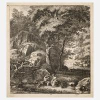 Idyll mit Hirtenpaar vor felsiger Kulisse am Bach, die Füße im Wasser badend, im Hintergrund weiden Rinder, Ziegen und Schafe am Seeufer, hierzu bemerkt Wikipedia: ”Gessners einst vielgepriesene Idyllen feierten ein goldenes Zeitalter ungestörter Eintracht, und obschon er sich auf Theokrit berief, war er der arkadischen Schäferwelt der italienisch-französischen Hofpoeten des 17. Jahrhunderts weit näher verwandt. ... zu seinen besten Werken zählen zwölf radierte Landschaften, die er 1770 herausgab.”, Radierung auf Bütten, um 1770, rechts unter der Darstellung in der Platte signiert ”S. Gessner” sowie Stichnummer ”4.”, Altersspuren, schön hinter Glas und Passepartout gerahmt, Plattenmaße ca. 20,5 x 19 cm. Künstlerinfo: auch Geßner, schweizerischer Zeichner, Radierer, Maler, Illustrator, Dichter und Kunsttheoretiker (1730 Zürich bis 1788 Zürich), 1749–50 Buchhändlerlehre in der Haude & Spenerschen Verlagsbuchhandlung Berlin, parallel Hinwendung zur Malerei und Radierkunst unter dem Einfluss von Karl Wilhelm Ramler, Rückreise über Halberstadt, Braunschweig, Wolfenbüttel, Hannover, Hamburg, Amsterdam, Straßburg, kurzzeitig Aufenthalt in Hamburg, hier beeinflusst von Friedrich von Hagedorn, 1750 Rückkehr nach Zürich und bis 1763 Mitarbeit im väterlichen Verlag mit Buchhandlung und Druckerei, Mitglied der ”Dienstags-Compagnie”, 1761 Mitbegründer der ”Helvetischen Gesellschaft”, 1763 Teilhaber der Firma Orell & Co. und künstlerischer Leiter der Porzellan- und Fayence-Manufaktur im Schooren in Kilchberg, 1765 Mitglied des Züricher Rats, 1780 Begründer der ”Züricher Zeitung”, Quelle: Thieme-Becker, Sikart und Wikipedia.