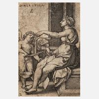 Blatt zwei der Folge „Die freien Künste“, Kupferstich, um 1520–50, in der Platte ligiertes Monogramm „GP“, betitelt „Dialectica“ und Nummer 2, siehe Hollstein German 83 und Bartsch 111, bis in die Darstellung beschnitten, Altersspuren, unter Passepartout montiert, Blattmaß ca. 7,4 x 5,1 cm. Künstlerinfo: auch Jörg Pentz, Benntz, Benz, Maler, Zeichner und Kupferstecher (um 1500 Westheim? bis 1550? Breslau), erwarb 1523 das Bürgerrecht von Nürnberg, gehörte 1524 mit Sebald Beham und Barthel Beham (Die 3 gottlosen Maler) zum engen Kreis des Reformtheologen Thomas Müntzer, nachdem ihre Zusammenkünfte verraten wurden, mussten die drei Künstler umgehend die Stadt verlassen, ab Sommer 1525 in Bad Windsheim ansässig, im Herbst 1525, nach mehreren Bittschriften, durften sie nach Nürnberg zurückkehren, Pencz blieb bis 1550 in der Stadt und arbeitete unter andern mit Hans Sachs zusammen, Quelle: Thieme-Becker und Wikipedia.