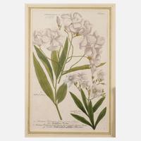 Blatt Nr. 755 mit Abbildung zweier unterschiedlicher Oleanderzweige, handkolorierter Kupferstich auf Bütten aus dem erstmals 1742 erschienenen 3. Band der ”Phytanthoza iconographia”, unten in der Darstellung lateinisch und deutsch bezeichnet ”a. Nerium Indicum flore carneo, Oleander, Unholden-Baum” und ”b. Nerium Indicum latifolium flore roseo pleno, Rosage double, wohlriechend-gefüllter Oleander”, rechts unten Monogramm ”H.” möglicherweise Stechermonogramm von Johann Jakob Haid (1704–1767), geringe Annotationen, hinter Glas und Passepartout gerahmt, Passepartoutausschnitt ca. 33,5 x 21,5 cm. Info: dt. Apotheker, Botaniker und Autor (1683 Gardelegen bis 1741 Regensburg), wohl Ausbildung in Hamburg, ab 1710 Apothekergehilfe in Regensburg, 1712 Übernahme der bankrotten Apotheke ”Zum schwarzen Mohren” in Regensburg und fortan selbstständiger Apotheker, in der Folge einflussreiche Amtsperson in Regensburg und Anlage eines botanischen Gartens, verfasste mehrere botanische Schriften, unter anderem sein teils posthum 1737–45 erschienenes 4-bändiges botanisches Monumentalwerk ”Phytanthoza iconographia”, Quelle: Wikipedia.