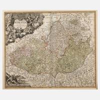 im oberen linken Bereich prachtvolle, mit zahlreichen Allegorien versehene Kartusche, hierin betitelt „Tabula generalis marchionatus Moraviae in sex siculos divisae...“, Darstellung des Gebiets zwischen Glatz im Norden, Ratibor im Osten, Stockerau im Süden und Pilgram im Westen, flächenkolorierter Kupferstich, um 1710, leichte Altersspuren, unter Passepartout und hinter Glas gerahmt, Darstellungsmaß ca. 48 x 57 cm. Künstlerinfo: dt. Kupferstecher, Verleger und Jesuit (1664 Kambach bis 1724 Nürnberg), vermutlich Schüler von David Funck, gründete um 1702 den eigenen Verlag ”Homännisches Landkarten-Offizin”, 1715 Mitglied der königlich preußischen Societät der Wissenschaften, Kaiser Karl VI. verlieh ihm den Titel eines ”Kayserlichen Geographen” und der russische Zar Peter der Große ernannte Homann zum ”Kayserlich russischen Agenten”, tätig unter anderem in Wien, Leipzig und Nürnberg, Quelle: Thieme-Becker und Internet.