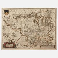 unten links in mit Rollwerk verzierter Kartusche betitelt „Lusatia Superior...“, unten rechts Distanzzeiger und oben links Wappen, Darstellung der Lausitz zwischen Senftenberg im Norden, Sprotta im Osten, Zittau im Süden und Dresden im Westen, grenzkolorierter Kupferstich, um 1630, erschienen bei Janssonius in Atlas Novus, leichte Erhaltungsmängel, unter Passepartout und hinter Glas gerahmt, Darstellungsmaß ca. 38,5 x 49,5 cm. Künstlerinfo: niederländischer Kartograf und Verleger (ca. 1588 Arnheim bis 1664 Amsterdam), Schüler von Jodocus Hondius, heiratete 1612 dessen Tochter Elisabeth und übernahm nach Hondius Tod 1612 dessen Verlag, den er weiterführte und das von Hondius herausgegebene Atlaswerk „Mercator-Hondius“ mit dem Zusatz „...-Janssonius“ weiter herausbrachte, 1639 Herausgabe seines bedeutendsten Werkes ”Theathre du Monde” in drei Bänden, das bis 1662 auf elf Bände anwuchs, stand in lebenslanger Konkurrenz zu Joan Blaeu, tätig in Amsterdam, Quelle: Wikipedia.