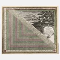in mit Rollwerk verzierter Kartusche betitelt „Curioser Städt-Zeiger zu denen vornemsten Städten in Deutschland...“ und im oberen Bereich bezeichnet „Poliometria Germaniae ac Finitimorum Quorundam Locorum Europae excuseper Matthäum Seutt. S. C. M. G. August.“, weiterhin prachtvolle Darstellung mit bergiger Landschaft und messenden Putten, kolorierter Kupferstich, um 1730, kraftvoller Druck, geringe Altersspuren, unter Passepartout und hinter Glas gerahmt, Darstellungsmaß ca. 49,5 x 56,5 cm. Künstlerinfo: auch Saiter, Seiter, Seuter Seyder, dt. Kartograph, Kupferstecher und Verleger (1678 Augsburg bis 1757 Augsburg), Sohn des Goldschmiedes Matthäus I., ab 1697 Lehre bei Johann Baptist Homann in Nürnberg, nach Augsburg zurückgekehrt, Mitarbeit im Verlag Jeremias Wolff, 1710 Gründung eines eigenen Verlages mit Druckerei, 1731 zum kaiserlichen Geographen ernannt, nach Seutters Tod 1757 wurde der Verlag durch seinen Sohn Albrecht Karl (1722–1762), den Schwiegersohn Tobias Conrad Lotter (1717–1777) und den langjährigen Mitarbeiter Johann Michael Probst (gest. 1805) weitergeführt, Quelle: Thieme-Becker und Internet.
