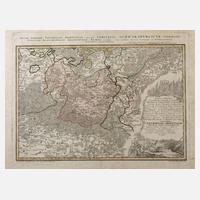 oben links in Kartusche bezeichnet „To his Grace John Duke of Marleborouch Prince of Mindelheim ...“, unten links betitelt „A new Map of Germany, Hungary, Transilvania & the Suisse...“ sowie Angabe des Kartographen Hermann Moll, verlegt bei Thomas Bowles, im oberen rechten Bereich Innenansicht des englischen Parlaments, Darstellung des Gebiets zwischen Lübeck im Norden, Mergenburg im Osten, Golf von Venedig im Süden und Paris im Westen, Kupferstich, grenz- und teilkoloriert, 1712, mittig übliche Faltlinie, geringe Altersspuren, unter Passepartout und zwischen zwei Scheiben gerahmt, Darstellungsmaß ca. 61 x 100,5 cm.