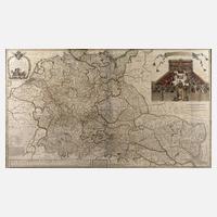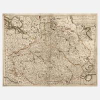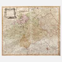 nach Adam Friedrich Zürner, in oberer linker Ecke figürliche Kartusche mit kleiner Bergbauszene und hierin betitelt „Circuli Supe Saxoniae pars Meridionalis fiveDucatus, Electroratus et Principatus Ducum Saxoniae ex Zolmanniais et Zürnerianis subsidije designata et edita Per Homannianos Heredes A. MDCCXXXIV“, Darstellung des Gebiets zwischen Berlin im Norden, Sagan im Osten, Bamberg im Süden und Goslar im Westen, Kupferstich auf Bütten mit Flächen- und Grenzkolorit, mittig übliche Faltlinie, geringe Altersspuren, gerahmt, Darstellungsmaß ca. 48,5 x 55,5 cm. Info Homanns Erben: Johann Baptist Homann (1664 Kambach bis 1724 Nürnberg, dt. Kupferstecher, Verleger und Jesuit) gründete um 1702 den eigenen Verlag ”Homännisches Landkarten-Offizin”, tätig unter anderem in Wien, Leipzig und Nürnberg, nach seinem Tod am 1. Juli 1724 ging sein Unternehmen auf seinen Sohn Dr. Johann Christoph Homann (1703–1730) über, der seine beiden Geschäftsführer Johann Georg Ebersberger (oder Ebersperger) und Johann Michael Franz zu Erben der Handlung einsetzte, nach seinem Tod 1730 wurde das Unternehmen unter dem Namen „Homannsche Erben“ (frz. Heritiers de Homann, lateinisch Homannianos Heredes) fortgeführt und erlosch erst 1848 mit dem Tod des letzten Besitzers Christoph Franz Fembo, Quelle: Thieme-Becker und Internet.