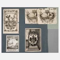 fünf Kupferstiche, 1.) Johann Adam Schmuzer, sen. – Warnecke 2099, 2.) für Herzog Friedrich August zu Braunschweig, (2 x) Warnecke 253, 3.) Notariatszeichen für Johann Friedrich Walter, Kupferstichexlibris, Warnecke 512 und 4.) für Johann Conrad Feuerlein, Kanzler der Universität Altdorf, auf Unterlagekarton montiert, unterschiedliche Erhaltungen, Darstellungsmaß ca. 9,5 x 7,2 cm.