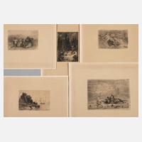 fünf Blatt, mit Darstellung verschiedener Szenen, Radierungen auf Papier, jeweils in der Platte signiert „a. achenbach“ sowie datiert zwischen 1847 und 1862, wohl spätere Abzüge, Papier gebräunt, ungerahmt, Darstellungsmaß max. 12 x 16,5 cm. Künstlerinfo: bedeut. dt. Maler, Graphiker und Karikaturist (1815 Kassel bis 1910 Düsseldorf), Bruder des Oswald Achenbach, ab 1823 in Düsseldorf ansässig, ab 1827 Schüler der Akademie Düsseldorf bei Wilhelm von Schadow, Kolbe, Schirmer und Schäffer, 1836 Übersiedlung nach München, 1838 nach Frankfurt am Main und 1839 endgültig nach Düsseldorf, unternahm zahlreiche Studienreisen, unter anderem nach Holland, Russland, Schweden, Norwegen, England, Frankreich, Tirol und Italien, 1859 zum Professor ernannt, erhielt zahlreiche Auszeichnungen wie 1885 Ehrenbürger von Düsseldorf, Mitglied mehrerer Akademien, Mitglied der Allgemeinen Deutschen Kunstgenossenschaft, der Münchner Kunstgenossenschaft, der Genossenschaft bildender Künstler Wiens und des Düsseldorfer Künstlervereins „Malkasten“, Quelle: Thieme-Becker, Vollmer, AKL, Dressler, Seubert, Müller-Singer, Müller-Klunzinger, Nagler, Saur ”Bio-Bibliographisches Künstlerlexikon”, Bruckmann ”Düsseldorfer Malerschule” und Wikipedia.