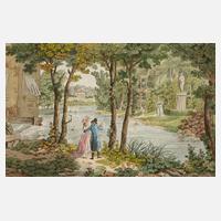 Ansicht einer Parkanlage im englischen Stil, mit großem Teich und Figurenstaffage, aquarellierte Radierung, um 1800, unter der Darstellung in der Platte signiert „Joseph Schaffer inve: et fecit“, alt auf Bütten kaschiert und auf Unterlagekarton aufgezogen, minimale Altersspuren, Darstellungsmaß ca. 18,4 x 28,3 cm. Künstlerinfo: österr. Zeichner und Graphiker (1757 Innsbruck bis 1825 Wien), Quelle: Thieme-Becker und Internet.