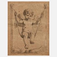 Darstellung des römischen Gottes der Liebe, als beflügelter Knabe auf einer Schaukel, ihm zu Füßen liegen seine Attribute Pfeilköcher und Bogen, Radierung auf Bütten, links unten datiert 1806 und undeutlich monogrammiert, geringe Altersspuren, schön hinter Glas und Passepartout gerahmt, Plattenmaße ca. 8 x 6 cm.