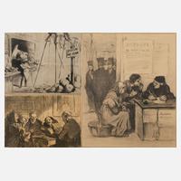 drei typische Arbeiten des bedeutenden Künstlers, Lithographien, um 1860, im Stein monogrammiert „H. D.“, unterschiedliche Erhaltungen, unter Passepartout und hinter Glas gerahmt, Passepartoutausschnitt max. 22 x 26 cm. Künstlerinfo: verwendete zeitweise das Pseudonym „Rogelin“, bedeutender franz. Karikaturist, Maler, Graphiker und Plastiker (1808 Marseille bis 1879 Valmondois), ab 1816 in Paris, zunächst Buchhändlerlehre und künstlerisch Autodidakt, kurzzeitig Atelierschüler von Eugen Boudin und Zeichenstudien im Louvre, um 1829 entstehen erste Lithos, ab 1831 Mitarbeiter der Wochenschrift „Caricature“, er entwickelt sich zu dem bedeutendsten politischen und sozialkritischen Karikaturisten seiner Zeit, zeitweise wegen Majestätsbeleidigung inhaftiert, nach 1835 (Septembergesetze gegen politischer Karikatur) Mitarbeiter der Tageszeitung „Le Charivari“ als satirischer Beobachter des Bürgertums, tätig in Paris, Quelle: Thieme-Becker und Internet.