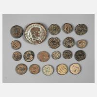 neunzehn Kleinmünzen, Buntmetall, zwei davon magnetisch, unterschiedliche Erhaltungen, meist Patina, Münzbilder aber meist zu erkennen, die größere Münze wohl Fälschung (Rand befeilt).
