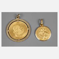 Münzanhänger, Gelbgold gestempelt 585, mit gefasster Neuprägung 1 Dukat, Münze mit dem Portrait von Franz Joseph I. aus Gelbgold 986/1000 im Gewicht von 3,49 g sowie Anhänger Gelbgold gestempelt 750, hierauf Relief von Christophorus und Oldtimer vor Alpen, G gesamt ca. 7,9 g.