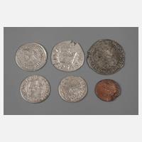 1: 6 Gröscher 1702 August der Starke, Silber, fast ss, G ca. 1,98 g. – 2: Halbgroschen Alexander (1501–1506), Billon, ss+, G ca. 1,1 g. – 3: Groschen 1624 Sigismund III., Billon, ss, G ca. 0,82 g. – 4: Kupfer-Boratinka Johann Kasimir, um 1665, s, G ca. 1,15 g. – 5: Dreipölker Sigismund III., um 1620, Billon, ss, G ca. 1,05 g. – 6: Halbgroschen, um 1500, Billon, ss, G ca. 1,38 g.
