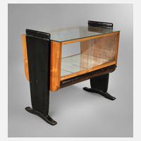 für UP Zavody, Tschechien, 1930er Jahre, nussbaumfurnierter Korpus, partiell schwarz gebeizt, Front mit Glasschiebetür, darunter Schublade mit gewölbtem Boden, Barfach innen verspiegelt, unrestaurierter Originalzustand, H 62 x B x 63 x T 42 cm.