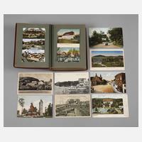 um 1910, ca. 135 Postkarten, Sammlung von überwiegend Gruss-aus-Karten, u. a. Höllenthal, Bingen, Görlitz, Gasthof zum Freischütz Pratau, Kirchheimbolanden, Magdeburg, Mannheim, Gruss vom Carneval in Freiburg, Col de la Schlucht, Sieber im Harz, Altbreisach, Löbauer Berge, Stubbenkammer, Deidesheim, Schießplatz Wahn, Bad Ilmenau, Worms, Rathenow, Rostock, Dobbertin, Feste Kaiser Wilhelm II., unvollständig besammeltes rotes Jugendstilalbum mit chinesischem Deckelmotiv, viele Karten farbig lithographiert, altersgemäß schöne Erhaltung.