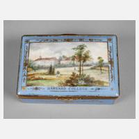 2. Hälfte 19. Jh., am Boden Schriftzug ”Saxony”, rechteckig mit hellblauem Font, der Deckel polychrom bemalt, partielle Vergoldung, vergoldete Messingmontierung, innen bemalt mit kleinen Rosenblüten, etwas berieben und Gebrauchsspuren, sonst jedoch unbeschädigt, L 12,5 cm.