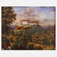 vor dem Umbau 1. Hälfte 19. Jh., unsigniert, flache Platte in breitem gekehlten Goldstuckrahmen, feine polychrome biedermeierliche Aufglasurbemalung, Rahmen etwas rissig und kleinere Farbfehlstellen im Bild, Gesamtmaß 21 cm x 23 cm.