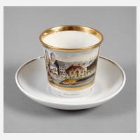 um 1860, ungemarkt, vertikal gerippte Glockentasse mit fein gemalter Rechteckkartusche, Marktplatz mit Figurenstaffage, in Gold gerahmt, originale Untertasse, etwas berieben, sonst unbeschädigter guter Zustand, H zusammen ca. 7 cm.