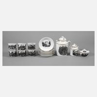 1. Hälfte 19. Jh., gemarkt CF Pirkenhammer, schwarz bedruckt und vergoldet, Kernstück und sechs Tassen mit Untertassen (eine ergänzt), Ansichten von Rauhenstein, Klosterneuburg, usw., stärkere Gebrauchs- und Altersspuren, H Kanne 17,5 cm.