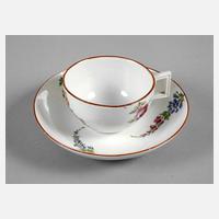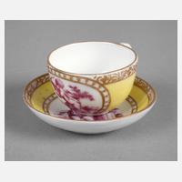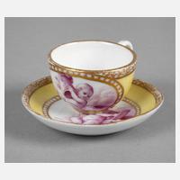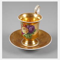 1. Hälfte 19. Jh., blaue Zeptermarke, rote Reichsapfelmarke, Tasse in hoher Glockenform mit Volutenhenkel, reich vergoldet, schauseitig mit Rosenblüten fein bemalt, passende Untertasse, diese im Spiegel mit einer Rosette, normale Altersspuren, H zusammen ca. 14 cm.