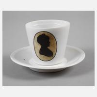 signiert und datiert 1904, blaue Zeptermarke, konische Tasse mit abgekantetem Henkel, schauseitig ein Portrait in Schattenmalerei, originale (?) Untertasse, diese ungemarkt mit Brandfleck, Altersspuren, H zusammen ca. 7 cm.